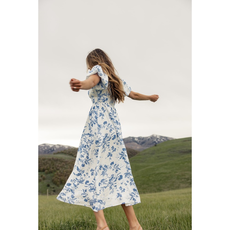 This pretty white dress is like a cloud with lovely blue flowers blooming all over. Featuring puff sleeves, a square neckline, and a double elastic waistband, this dress is perfect for twirling and feeling lovely!lined skirtpockets// paired with the madiso