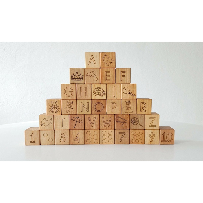 This gorgeous set of 36 blocks is sure to become a long lasting family heirloom. Made from maple hardwood, the variations in color are a beautiful representation of the different Maple trees that were used. This set of36 blocks are permanently engraved on both the front and back: Upper case letter front withcorresponding picture on back of 26 blocks, Numbers 1-10 on the front with corresponding number of dots on the back of the remaining 10 blocks.