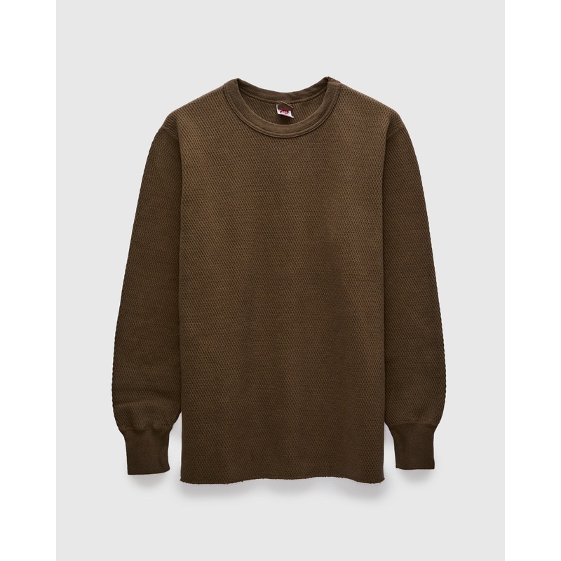 • Designed as the ultimate base layer, UES’ Double Honeycomb Thermal is constructed at a substantial 16.5oz weight using old-world knitting machines. Built for maximum insulation and comfort, the fabric is exceptionally thick with a plush interior, making it suitable as either a standalone piece or a foundational layer during colder months. Cut in a slim profile, the shirt is finished with ribbed cuffs, a reinforced collar, and traditional four-needle flat-seam construction.
