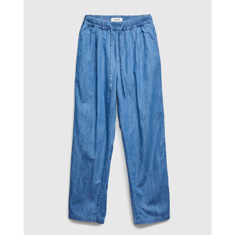 • Modeled after French work trousers, the Doune Pants are an elasticated waist, slant-pocket trouser sewn using washed cotton denim fabric. The pants are finished with pockets at the waist and rear, adjustable drawstring, and elastic waistband.