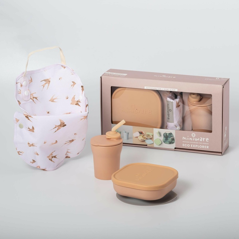 The bundle that supports minis growing and learning.Including a suction bowl with silicone lid, an extendable bib that becomes an apron and a cup that transforms in 3 stages, this bundle supports mess-free learning whether exploring new foods or exciting a