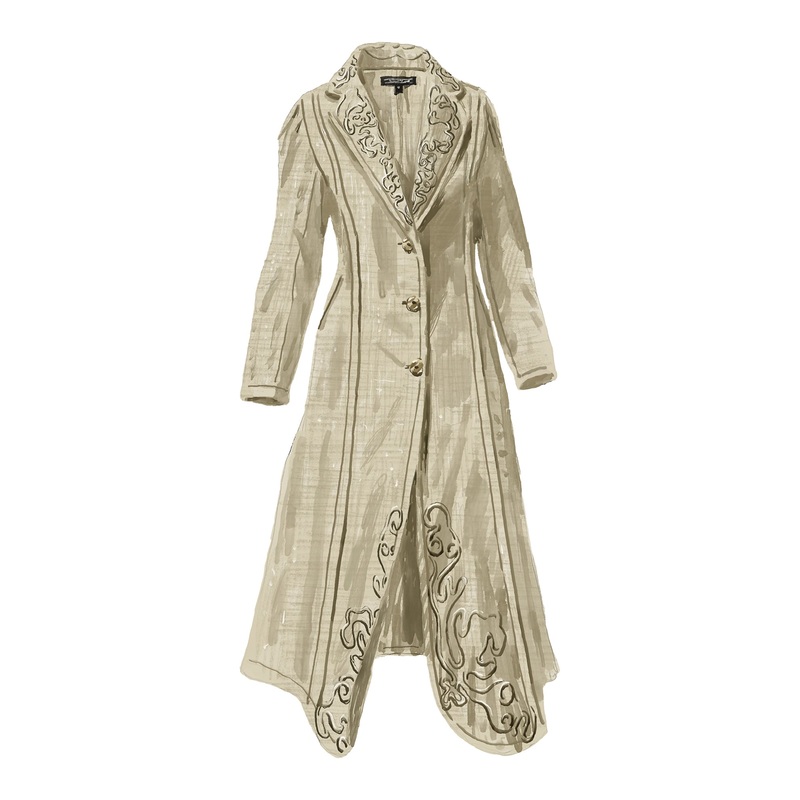 Edwardian Embroidered Duster (No. J8103). Proper English linen duster with a little panache stitched on. Soutache appliqu along collar, lapels, cuffs, center front sweep, and center back panel sweep. Three-button closure. Knife pleat detail at sleeve cap. Long double vent at back sweep. Dramatic mid-calf length, perfect for motoring through Tuscany or strolling through South Oxfordshire. Imported.