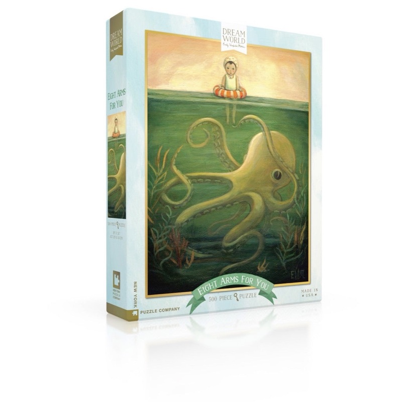 A young swimmer floating on the water’s surface is unaware of the eight arms of the monstrous octopus that lurks below.