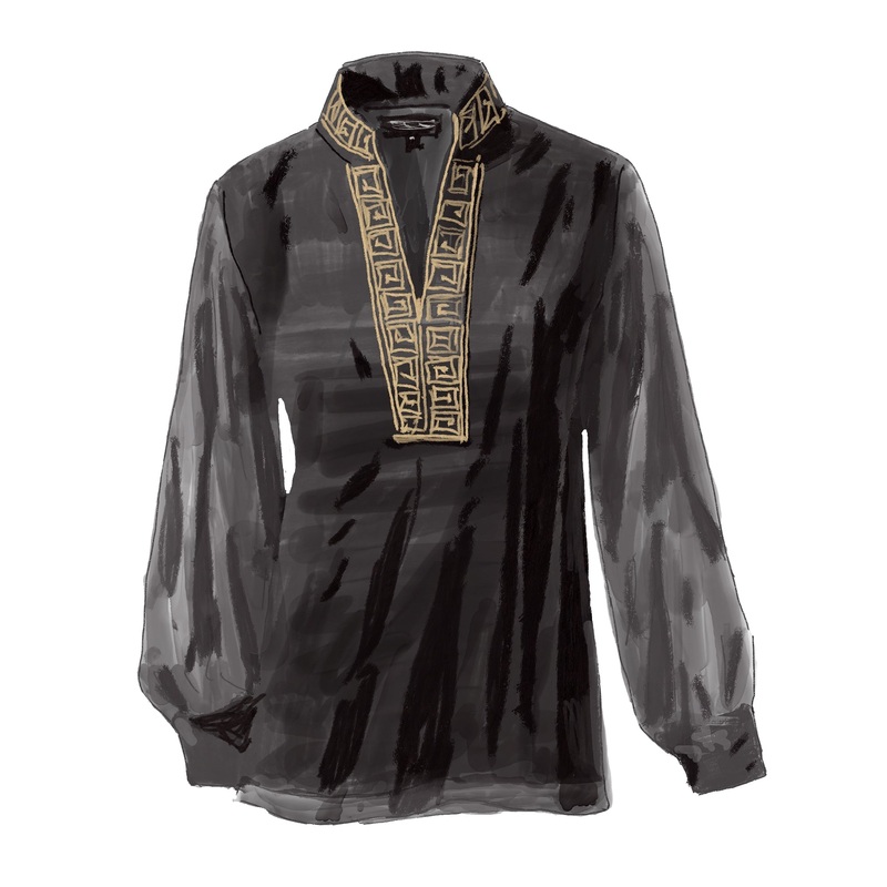 Embroidered Kurta Top (No. 7040). Viscose. Lined in 100% cotton. Hook and eye closure at bottom of collar. Embroidered neckline and collar. Slit neckline with Mandarin collar. Cuffed blouson sleeves. Lined body. Imported.