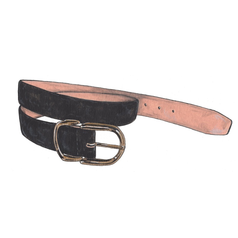 The Emilia Belt (No. 6929). Prong on the buckle for fit adjustment. Antique brass buckle on supple Italian suede sourced from Italian tannery Gruppo Mastrotto. Imported.