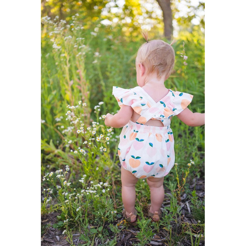 A fun and easy baby romper in our signature extra soft and stretchy fabric with ruffled sleeves, adjustable shoulder straps and three snap closure for easy changes!Featuring our Sweet Peach all over print Try our matching sibling looks!95% Cotton 5% Spande