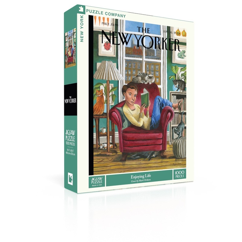 Step into a vibrant city apartment filled with charm, color, and cozy vibes with the “Enjoying Life” 1000 Piece Puzzle, inspired by the September 16, 2024, cover of The New Yorker by Mark Ulriksen. This delightful illustration captures a serene moment of urban lifea woman relaxing in her chair, engrossed in a book, while her playful cats frolic around her. The bright and intricate artwork radiates warmth and joy, filled with captivating details that make piecing together this scene an immersive and engaging experience.