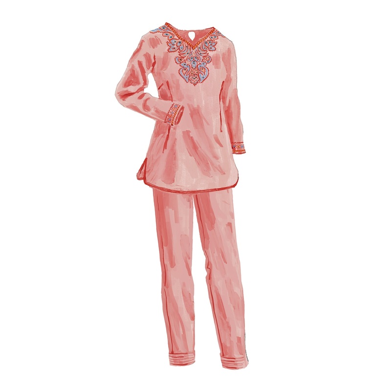 Epiphany Tunic Set (No. 7044). Luxuriously embroidered 100% cotton tunic and pant. Top has a keyhole back opening and hook and eye closure. Piping finishing. Embroidery at neckline and sleeve opening. Bottom has elastic and drawstring at waist. Imported.