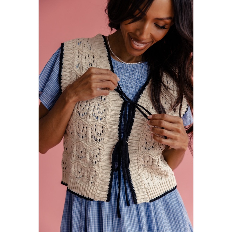 Vintage feels, modern fit. This contrasted crochet vest is the perfect mix of cozy and trendy. Style it your way and make it yours!adjustable self-tie frontsemi-sheer// paired with the return to me smocked dress, free people danni shorts in steelblue, + ro