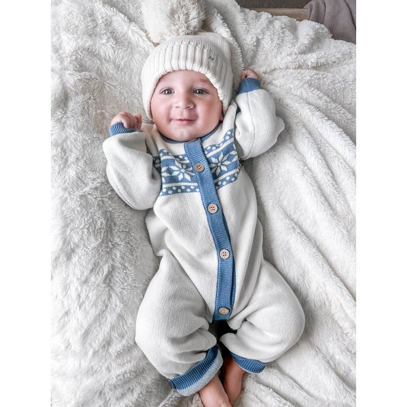 Get cozy with a little Nordic charm! Our Fair Isle Jumpsuit is a modern twist on a classic, combining chic ski chalet vibes with organic cotton yarn for the perfect balance of style and fun. With a decorative knit pattern featuring stripes and those iconic 8-point Nordic stars (hello, selburoses!), this jumpsuit brings all the cozy feels. Whether you’re indoors or out, its perfect for any adventure. Plus, the front button closure and hidden snaps along the inseam make quick changes a breezebecause, lets be honest, babies dont wait for anyone.