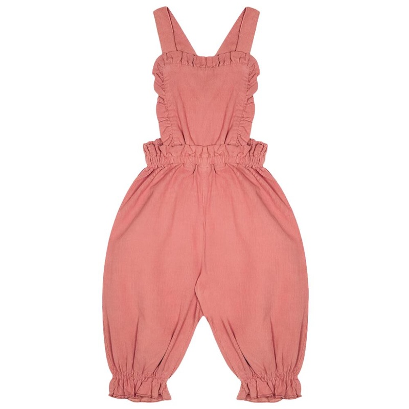 Baby jumpsuit in baby corduroy with elastic bottom & waistband with crossed straps in back and front piece with frill.