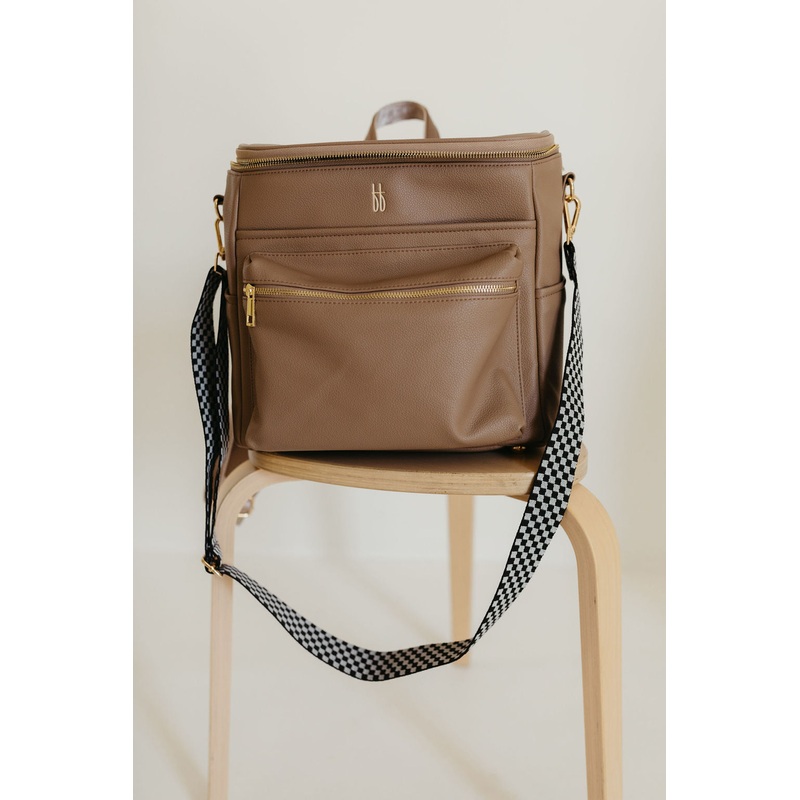 Our detailed black checkerboard woven shoulder strap is included with every bag. Your bag also comes with a vegan leather changing mat which is both aesthetically pleasing and space-saving by design.
