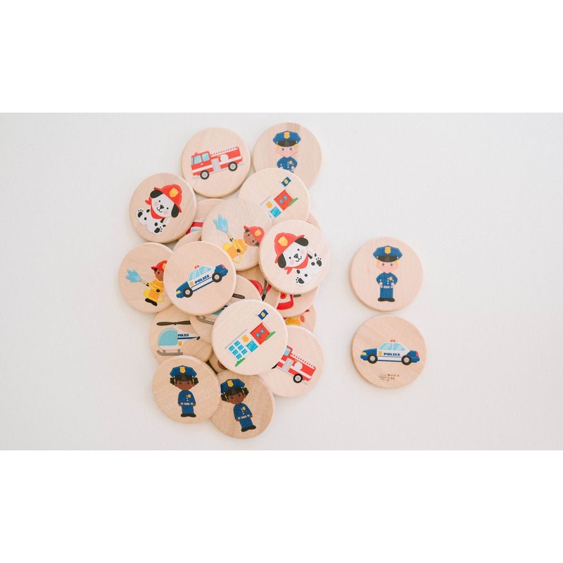 They come to our rescue when we are hurt or in trouble so let's celebrate them with a matching game! This memory matching set consists of 12 designs featuring the heroes in our lives, First Responders, on 24 wooden tiles. It can be enjoyed solo or with the