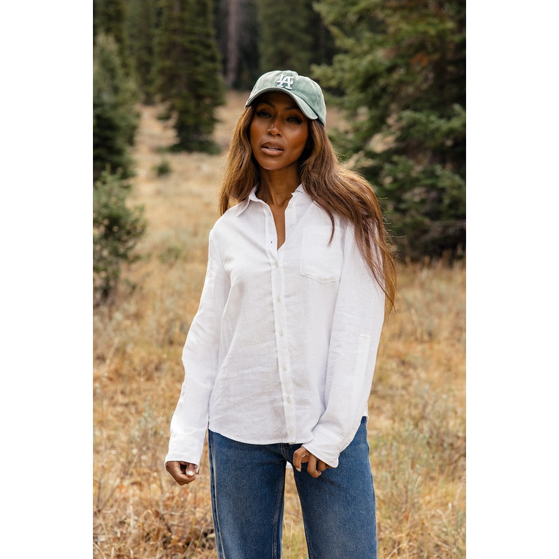 The First Times Linen Button-Up features a classic fit and collar, rounded hemlines, and functional buttons. Perfect for layering, this blouse is an instant classic!