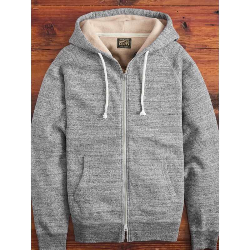 • Knit in Japan, Wonder Looper blends USA-grown organic FoxFibre cotton with Japanese construction. Sourced from Californias Viriditas Farm, FoxFibre cotton is known for its natural nep texture and soft yet durable feel. The Fleeced FoxFibre Zip Hoodie features a 345GSM brushed back knit, crafted from a mix of organic and recycled cotton yarns. The recycled cotton is gathered from excess fibers lost during the yarn-spinning process, combining long and short staple cotton for a naturally textured finish.