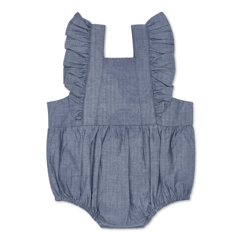 100% organic chambray cotton Dark indigo wash Hemmed waistline 3 snap closure Ruffled short sleeves