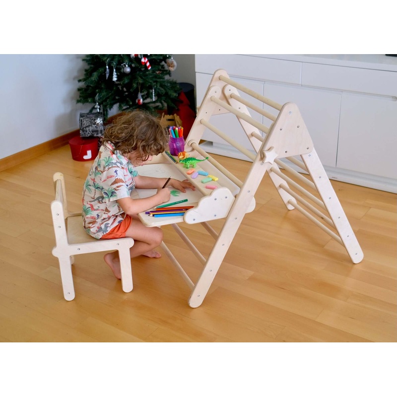 - Versatile Play Set: Elevate playtime with a foldable Montessori Climbing Triangle, perfectly complemented by a functional kids’ table and chair.