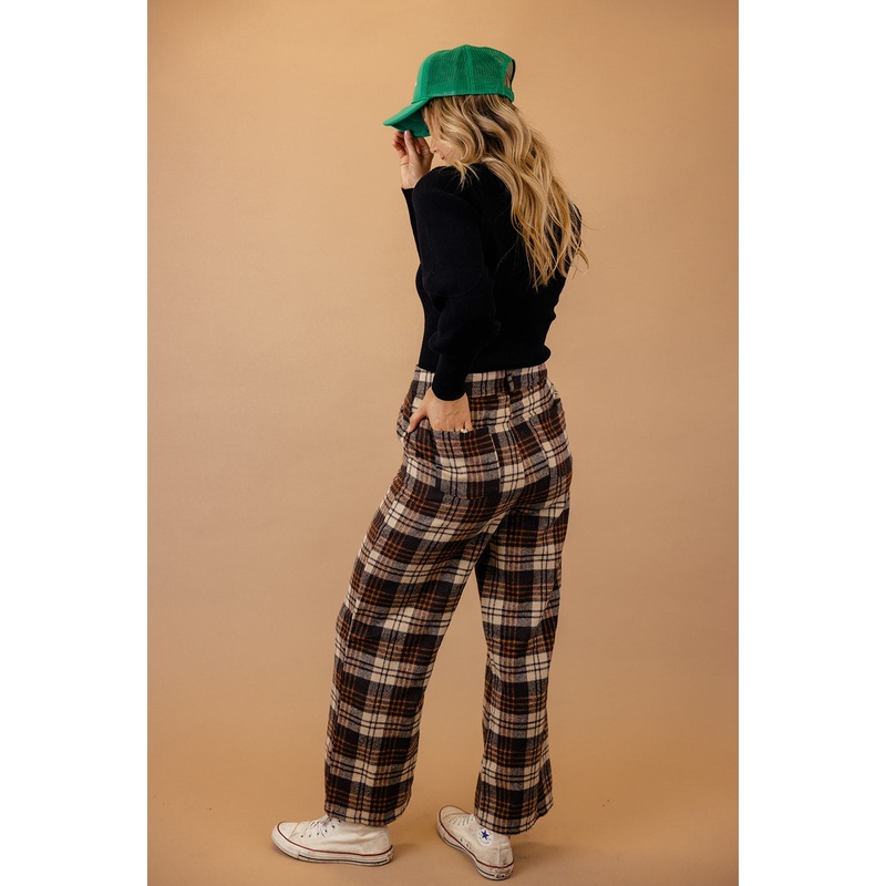 These pants feature a classic plaid pattern with a high-rise waist for a flattering fit. The four-pocket design adds functionality to fashion, and the fleece exterior ensures warmth and coziness. Elevate your winter wardrobe with these versatile and chic plaid pants.