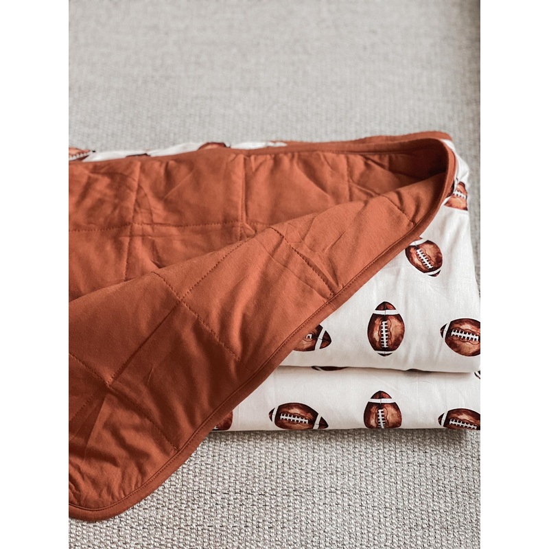 Introducing our Football Print Quilted Bamboo Blanket, designed for your toddler's ultimate comfort and style. Made from 95% Bamboo Rayon and 5% Spandex on the outside and lined with 100% Polyester, this blanket is silky-soft, hypoallergenic, and just the