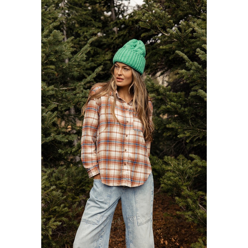 This classic plaid flannel features rounded hemlines, single-button sleeve cuffs and a front patch pocket. We love a classic look and the For A Moment Plaid Flannel doesn’t disappoint!// paired with the free people crvy outlaw wide leg jeans + the free people coast line beanie in green