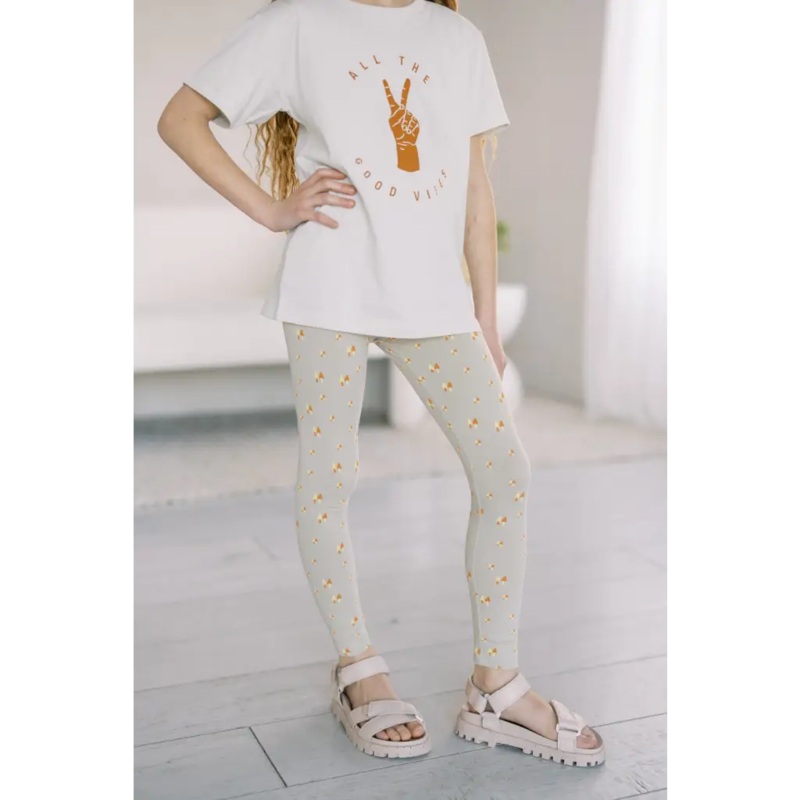 Spreading the good vibes with the softest, flexible lightweight leggings around. Perfect for all the seasons. Fit and feel designed by the gals at Polished Prints. Ethically made in Bangladesh. Artwork created by Annabel Gemmel.The Deets: - Made of 95% Org