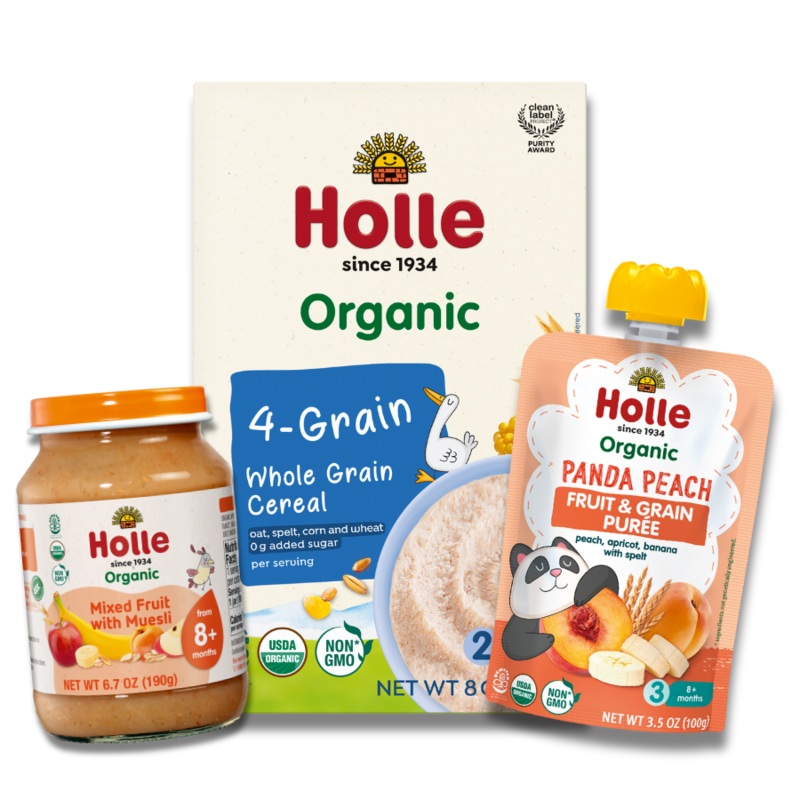 This variety bundle includes Holle organic whole grain cereal, organic baby food and organic pouches. The fruits and veggies used in Holle’s recipes come fromregenerative farms. Holle baby food recipes are made without added sugar, preservatives, or artificial ingredients.