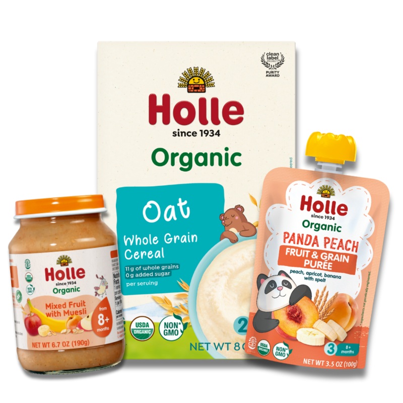 This variety bundle includes Holle organic whole grain oat cereal, organic baby food and organic pouches. The fruits and veggies used in Holle’s recipes come from regenerative farms. Holle baby food recipes are made without added sugar, preservatives, or artificial ingredients.