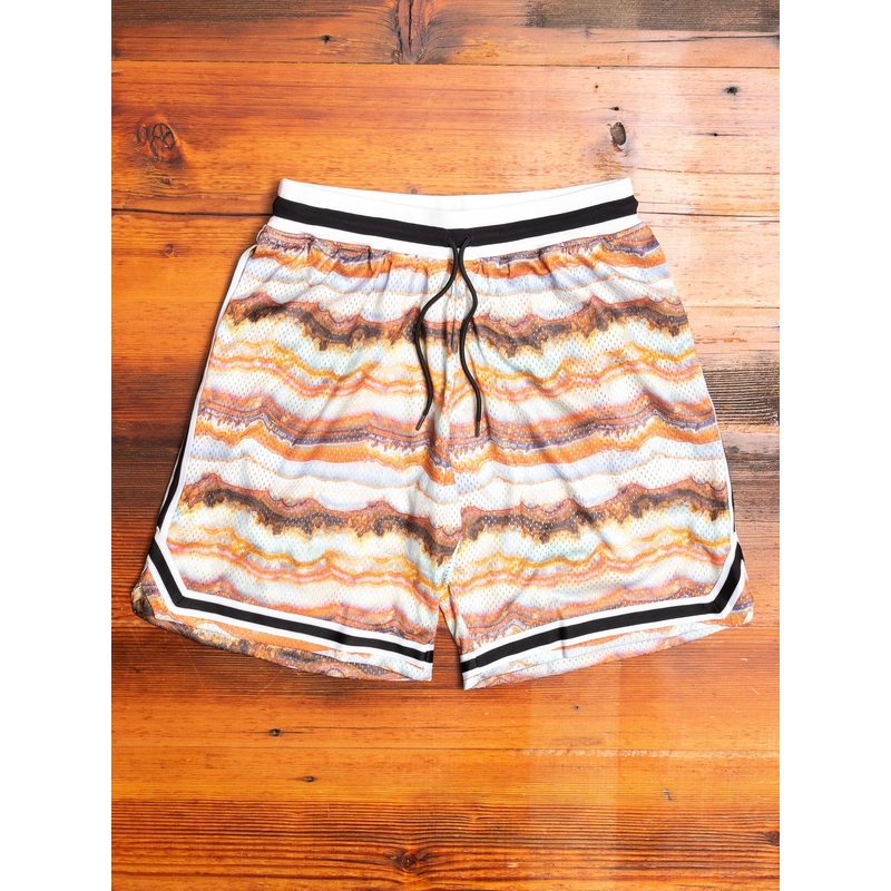 DetailsSizingBrand InfoCut in a relaxed fit, theGame Shorts from John Elliott are contemporary basketball shorts featuringa marbled orange and brown toned printinspiredby natural occurring geographical cross sections. The shorts are crafted with John Ellio