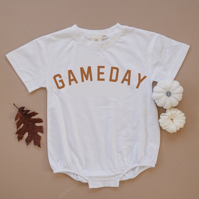 Gameday T-Shirt Romper: An excellent pick for your little one's game day look. Crafted from 100% cotton, this romper comes in classic white with brown lettering, offering both comfort and style for your baby or toddler's game day attire