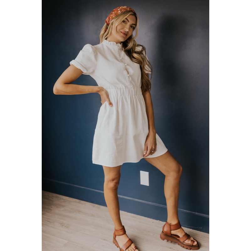 TheGia is like a little white dress but better. Subtle puff sleeve. Elastic waistband. Gathered skirt. Working buttons. Mock neck. Flirty length. She makes the perfect special occasion dress. Getaway dress? Get the Gia. Bridal shower? The Gia. Sunday churc