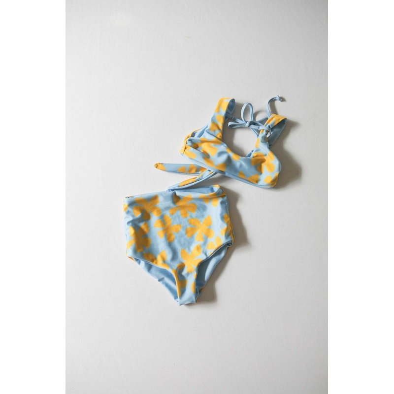 Reversible seamless construction with solid light blue color on reverse side. Adjustable straps.Eco-recycled printed fabric. 85% recycled poly, 15% spandex.