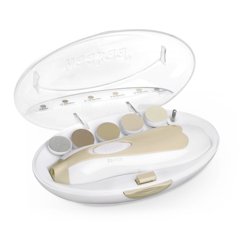 Attach the trimmer pad suitable for your child’s age and gradually file down their nails! The trimmer pads make your baby’s nails smooth and don’t leave sharp edges that may scratch their delicate skin. We’ve also included a metal pad and cone so parents can file down their nails too!
