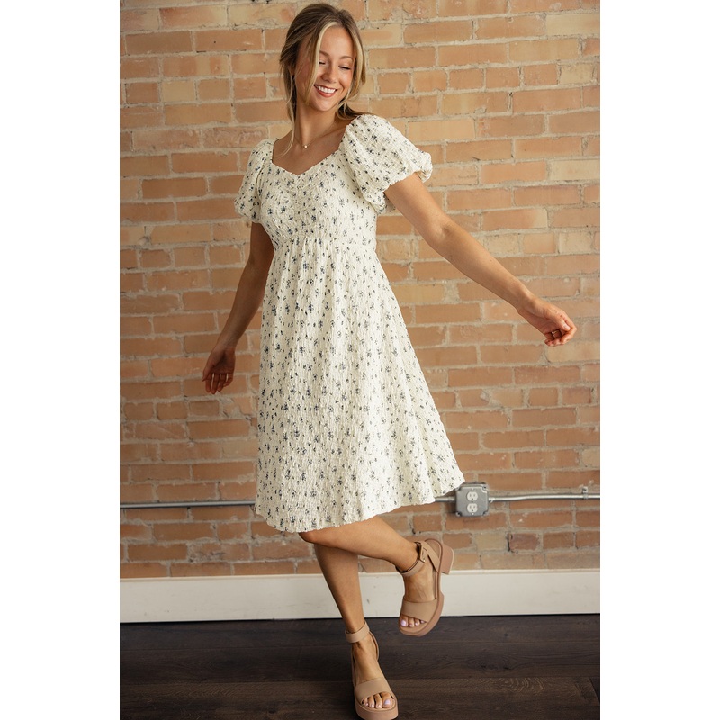 This dress is an Easter beauty. The Hadlee features a sweetheart neckline, puff sleeves, and the daintiest florals. With an elastic waistline and shirred material, you will be comfortable and beautiful all day long in this dress!stretchy textured fabricela
