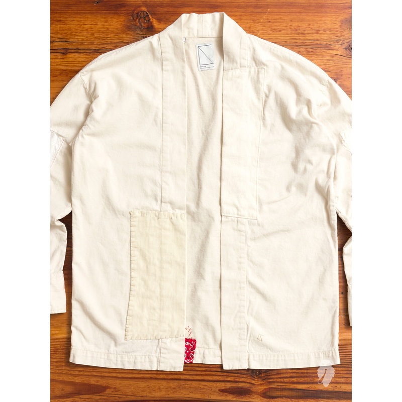 • The signature Haori Western from SOULIVE is the brand’s contemporary take on the traditional Japanese haori jacket. Made from a lightweight denim fabric, this shirt blends elements of customary Japanese garb with western-style attire, creating a unique shirt that is both contemporary and classic. This limited edition installment was sewn using unbleached white yarn that was then washed for a soft feel and worn look. Patched with contrasting red fabrics and bandanas that will age with the garment.