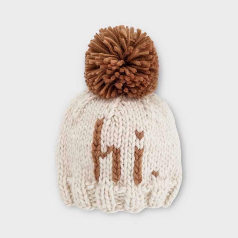 What a cute way to greet the world! This beanie is hand knit in cozy Natural hued yarn with the word 'hi.' in Pecan colored yarn. Topped with a Pecan yarn pom pom, this looks great with everything and is a fun gender-neutral baby gift.Why we love this hat:
