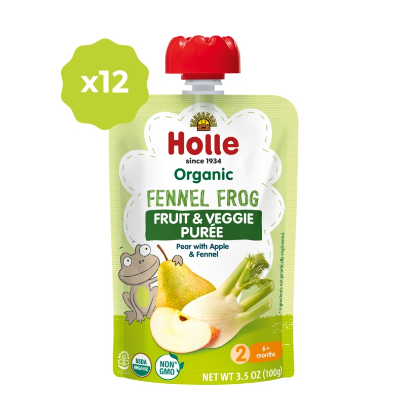 Fennel Frogis a tasty blend of organic pear, apple and fennel. Oneorder ofFennel Frog Organic Fruit & Veggie Puree offers12 individual pouches of finely pureed organic fruit andveggies grown on regenerative farms without any added salt or refined sugar.