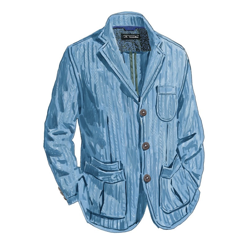 Horsemans Denim Blazer (No. J8678). Made froma blend of 55% linen and 45% cotton. Ample pockets for storage. Unconstructed (and therefore very packable) and unlined, except for a printed chambray half-yoke. Machine wash. Imported.