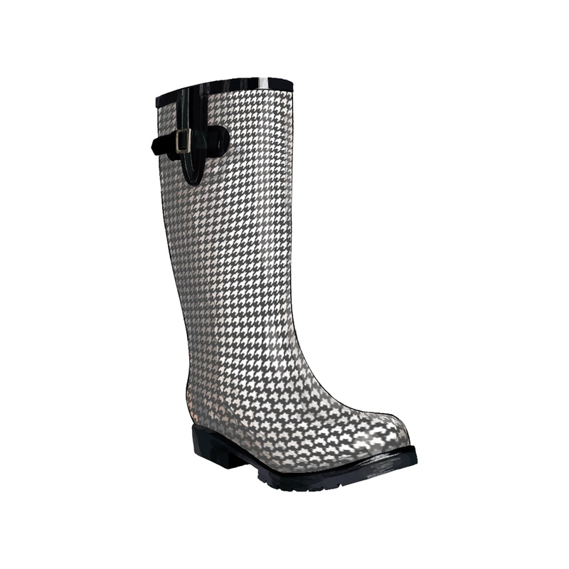 Houndstooth Rainboot (No. J8891). Intended, of course, for making a style splash wherever the next rainy day takes you. Textured-finish rubber upper with comfortable knit lining. Glossy rubber trim and outsole. 1 1/4" heel height, 12" shaft, and 14 1/2" ca