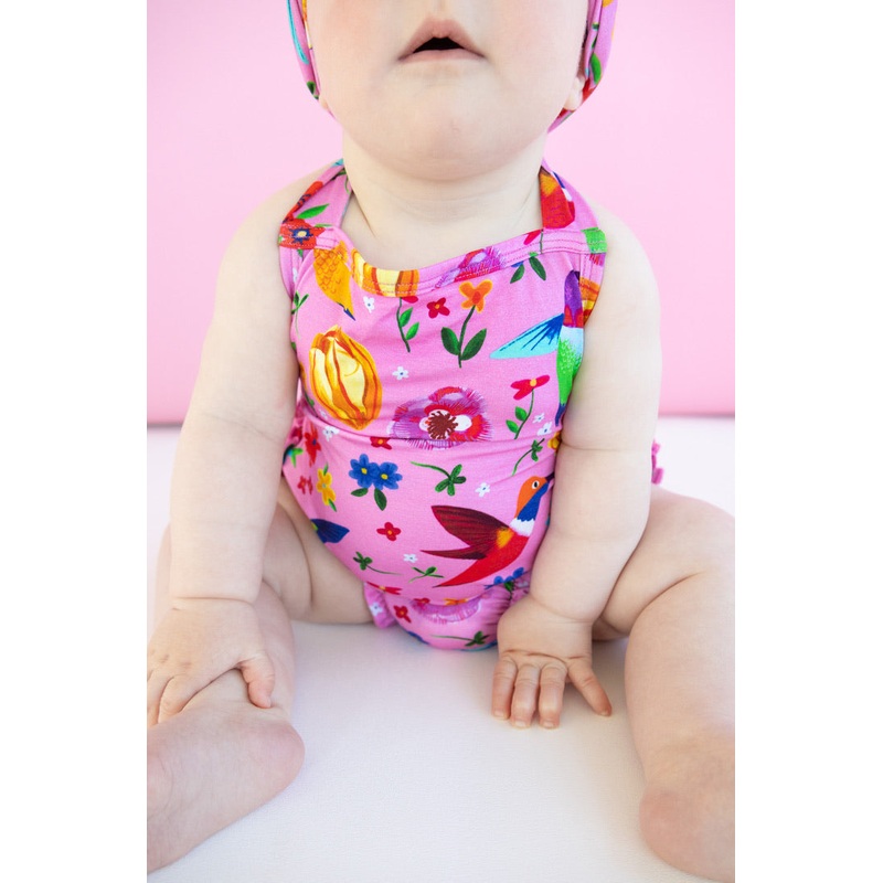 Introducing our Hummingbird Floral Halter Bubble Romper, made from our signature 200gsm bamboo blend. With tied straps and snaps for easy diaper changes, this romper also features ruffles on the bum for extra cuteness. Get ready for thousands of compliment