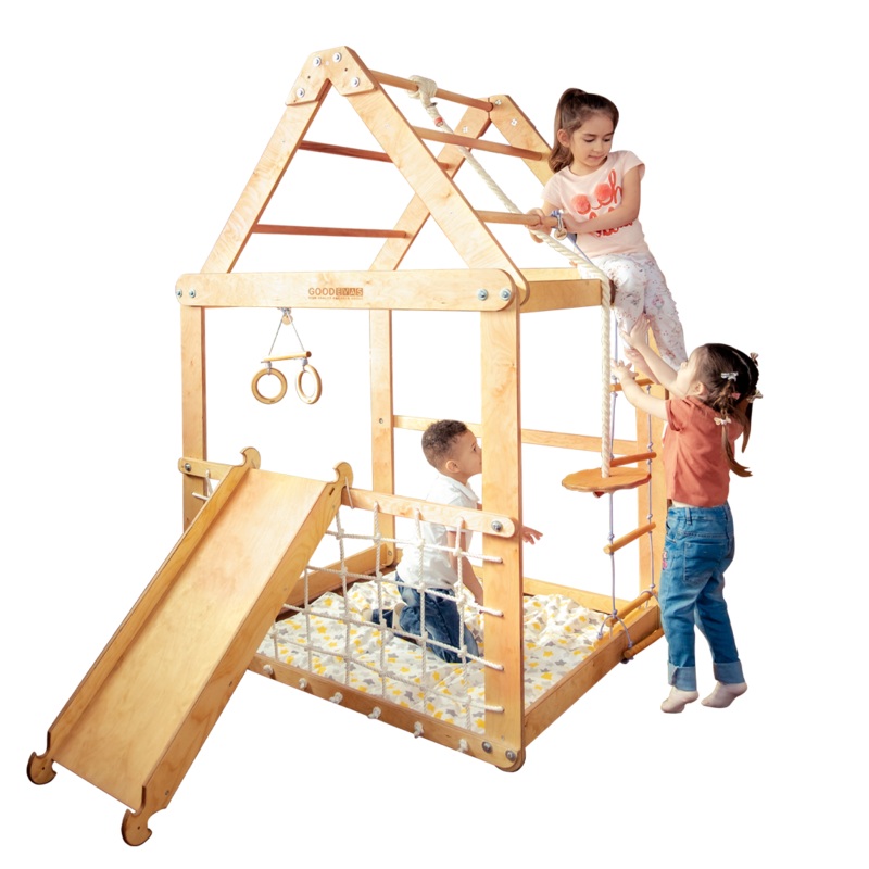 Goodevas wooden playhouse is a Montessori-style climbing playground for toddlers. Provide your kids with the freedom to explore, create, and develop their own games. The playhouse allows children to show creativity while developing such important qualities as balance, coordination, and motor skills. There are plenty of activities here to keep your child busy with fun: