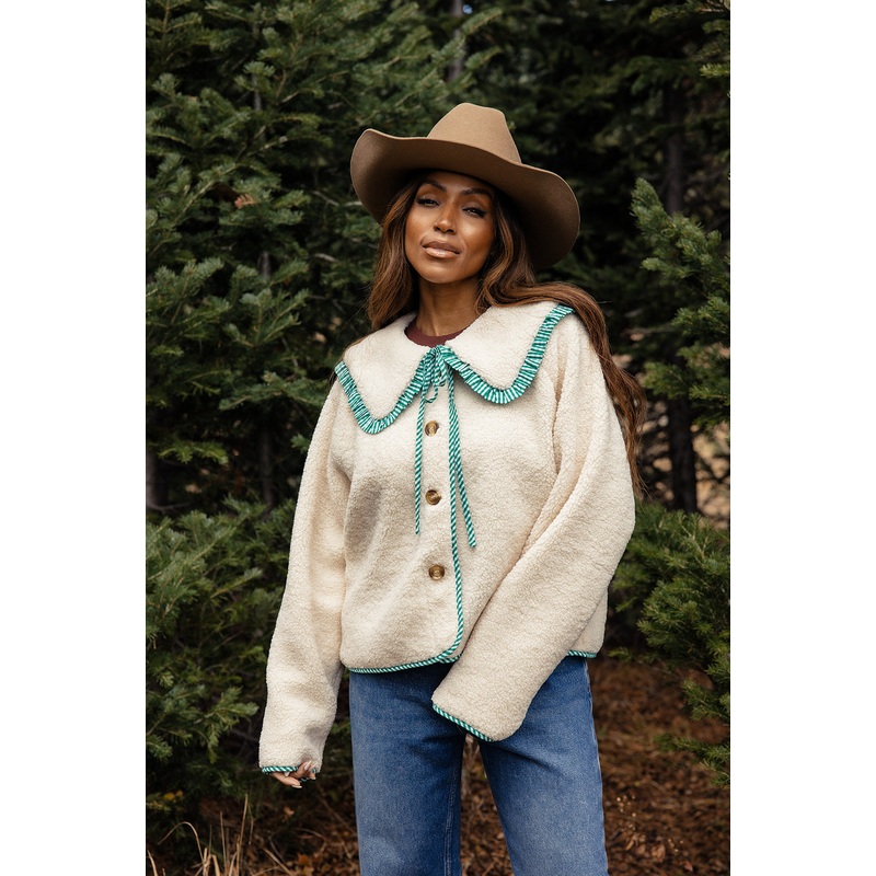 Excuse me, this is the cutest sherpa jacket ever! Featuring gingham-piped hemlines, raglan sleeves, and a peter pan collar, you will stand out in the best way in the Into The Mystic Collared Sherpa Jacket.