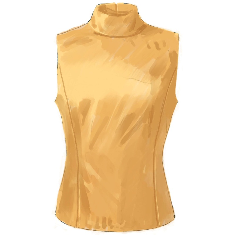 Its Your Moment Blouse (No. 5826). Glamourous fitted sleeveless blouse in pure silk satin. Mock neckline. The back collar, which opens to a v-shape, is secured with three eye- catching antique brass and gold jewel buttons. Front princess seams and back-sha