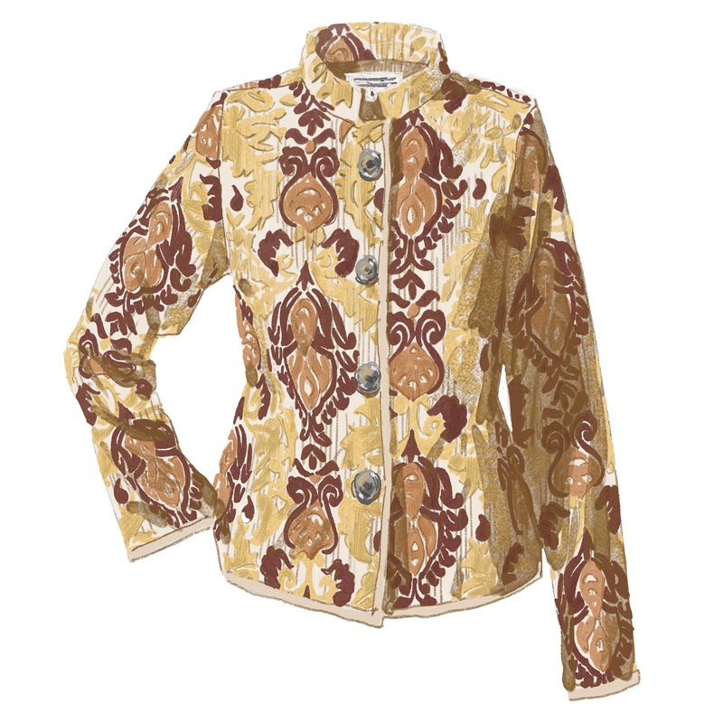 Jacquard Tapestry Jacket (No. J7045). Floral tapestry jacket in cotton poly viscose chenille jacquard. A tapestry may use up to 36,000 Jacquard perforated cards Even with the help of computers, the process requires great skill. From a selection of around 1000 shades, weavers match the yarn colours and thread the loom with approximately 12,000 horizontal warp threads arranged in order on the loom. Threads pass through the eye of each of the 12,000 coordinating vertical loom heddles. Lined in 100% cotton. Piped finishing. Mandarin collar. Jacquard fabric. Falls below waist. Horn buttons. Imported.