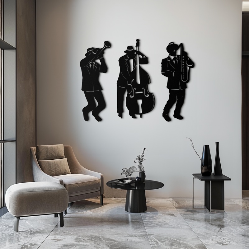 Bring the rhythm of jazz into your space with this Jazz Musicians Metal Wall Art. This stunning three-piece silhouette features jazz performers playing the trumpet, double bass, and saxophone, capturing the soulful essence of live music. Crafted from 1.5 mm premium steel, each panel is coated with durable electrostatic paint for long-lasting resistance against rust and fading.