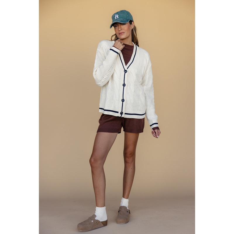 Just like Folklore... This cable knit cardigan features an oversized fit, functional buttons, and a classic style. Pair with anything in your closet and get ready for a dreamy Fall.cable knit textureoversized fit// paired with a set coming soon