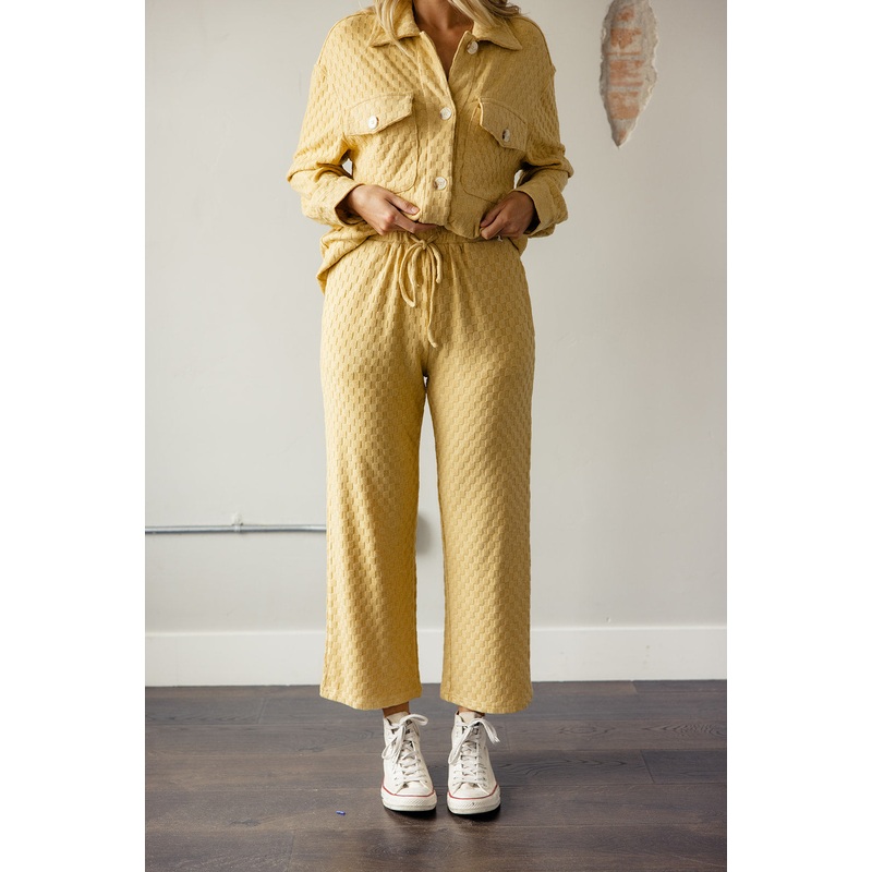 I love a pair of cozy pants that still have a lot of style and the Keonna Textured Pants. are my new fav! Featuring a heavyweight stretchy knit, elastic waistband with a drawstring, I can't wait to see how you style them!textured checkered patternwide legp