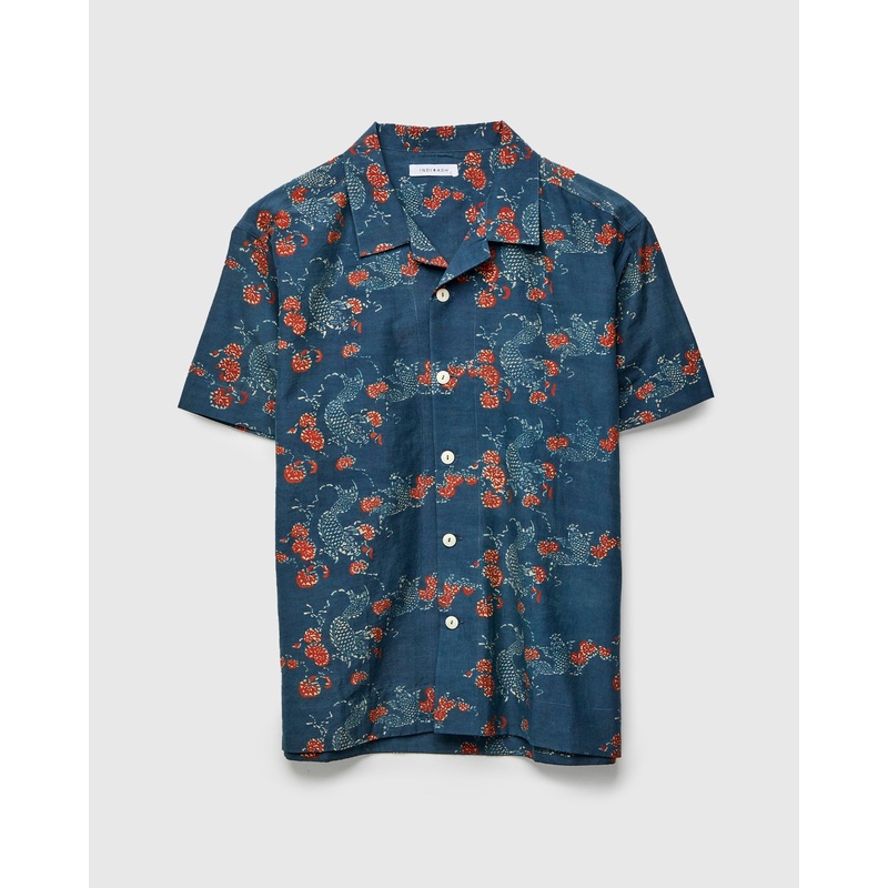DetailsSizingThe Lake Camp Shirt from Indi + Ash is an open collar camp shirt crafted in a relaxed fit. This special iteration features an original koi fish design, printed using natural indigo and madder dyes in a traditional Ajrakh resist dye process. Cu