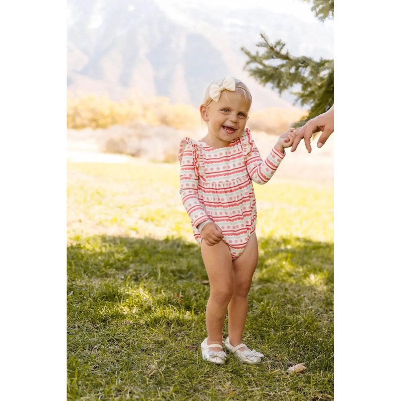 A fun and easy baby romper in our signature extra soft and stretchy fabric with ruffled shoulder with long sleeves, and three snap closure for easy changes!