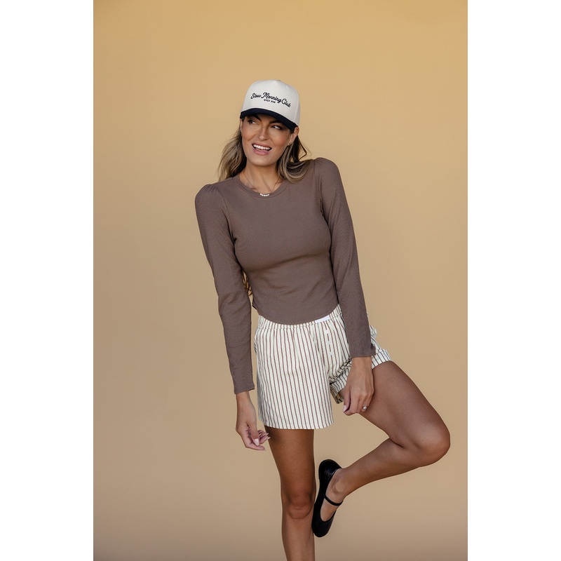 This simple form-fitting long sleeve features ribbed material, a gathered sleeve, and raw seams. Like Clockwork, this tee is one that will be on your regular rotation!rounded hemlineraw seam detailing// paired with the about time striped boxers