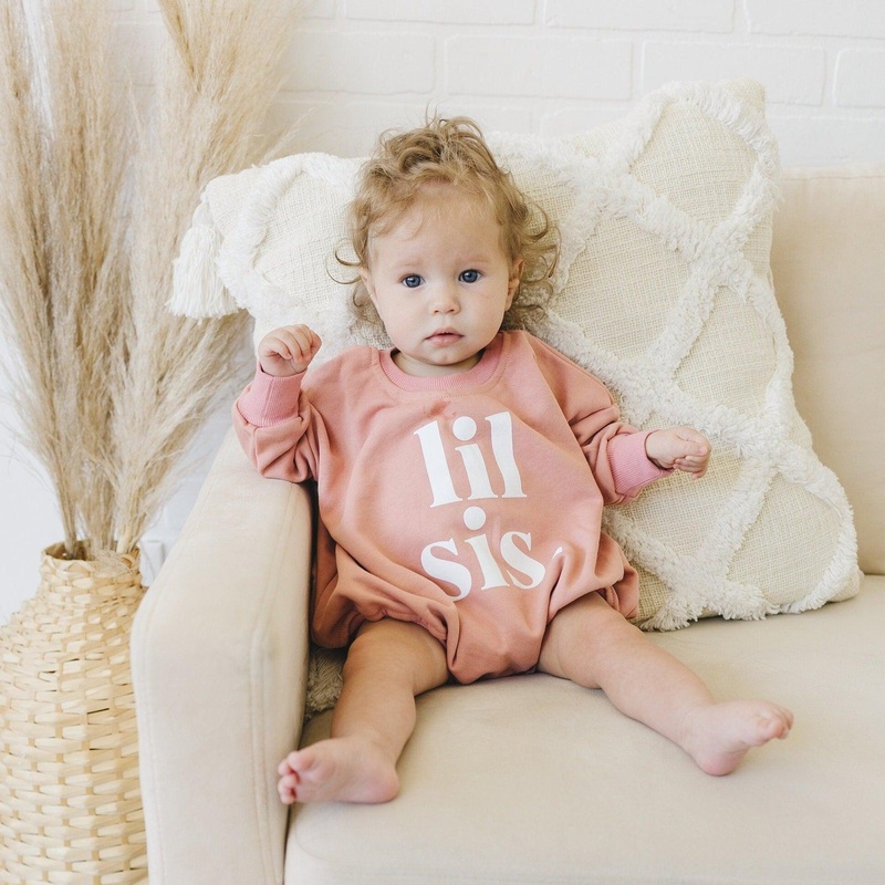 Lil Sis graphic oversized sweatshirt romper with snaps at crotch. Lightweight terry material.